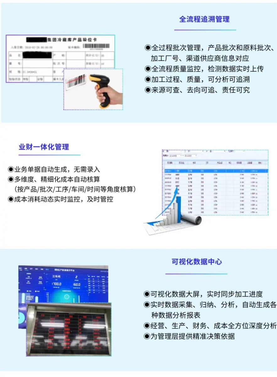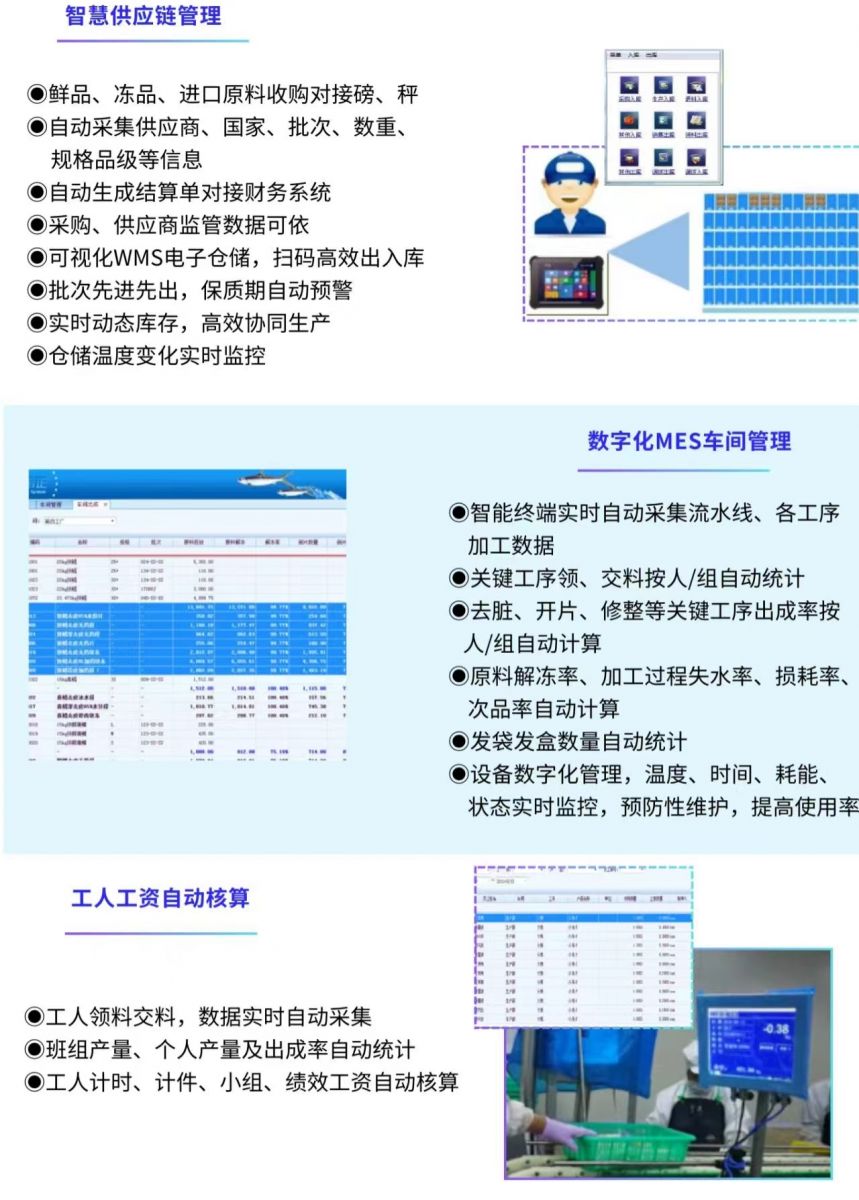 針對(duì)魚、蝦、貝、蟹等水產(chǎn)品的不同加工特性,采用信息化手段對(duì)其全業(yè)務(wù)鏈進(jìn)行數(shù)字一體化全面管控,包括采購-前處理-調(diào)理/熟制加工-冷凍-包裝-入庫-銷售發(fā)貨等所有環(huán)節(jié),幫助水產(chǎn)加工企業(yè)實(shí)時(shí)掌握生產(chǎn)數(shù)據(jù)、即時(shí)庫存,優(yōu)化產(chǎn)線作業(yè)、提高生產(chǎn)和管理效率,有助降低成本、提高生產(chǎn)效率,實(shí)現(xiàn)全流程質(zhì)量安全追溯。
