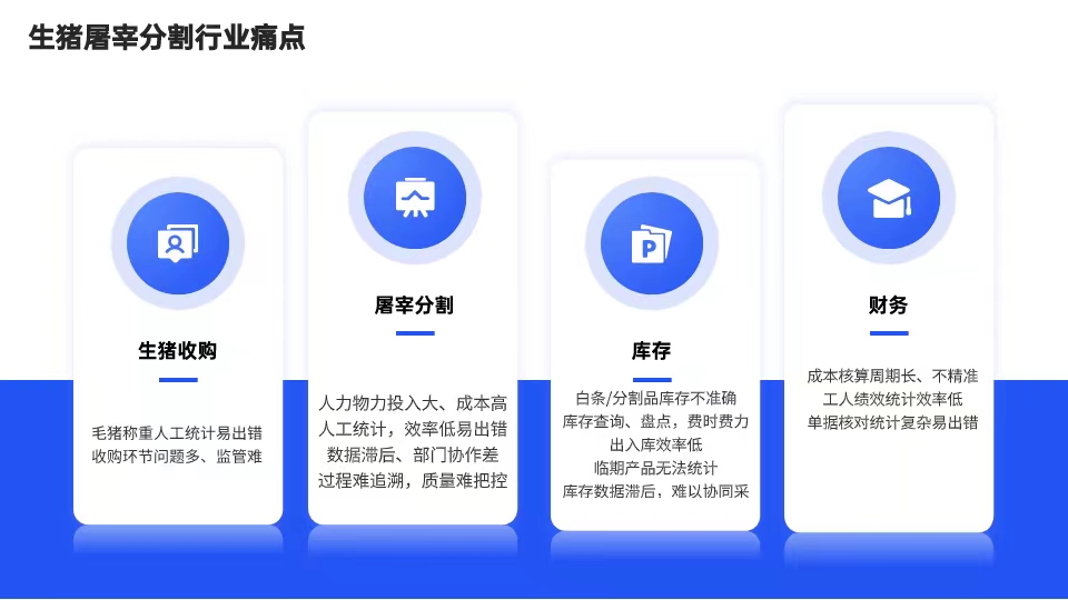 建立高效的全程數(shù)字化管理平臺,屠宰加工流程標準化。對各環(huán)節(jié)進行有效監(jiān)控和分析,減少各環(huán)節(jié)的漏洞,降低廢品率和能耗,降低企業(yè)管理成本。