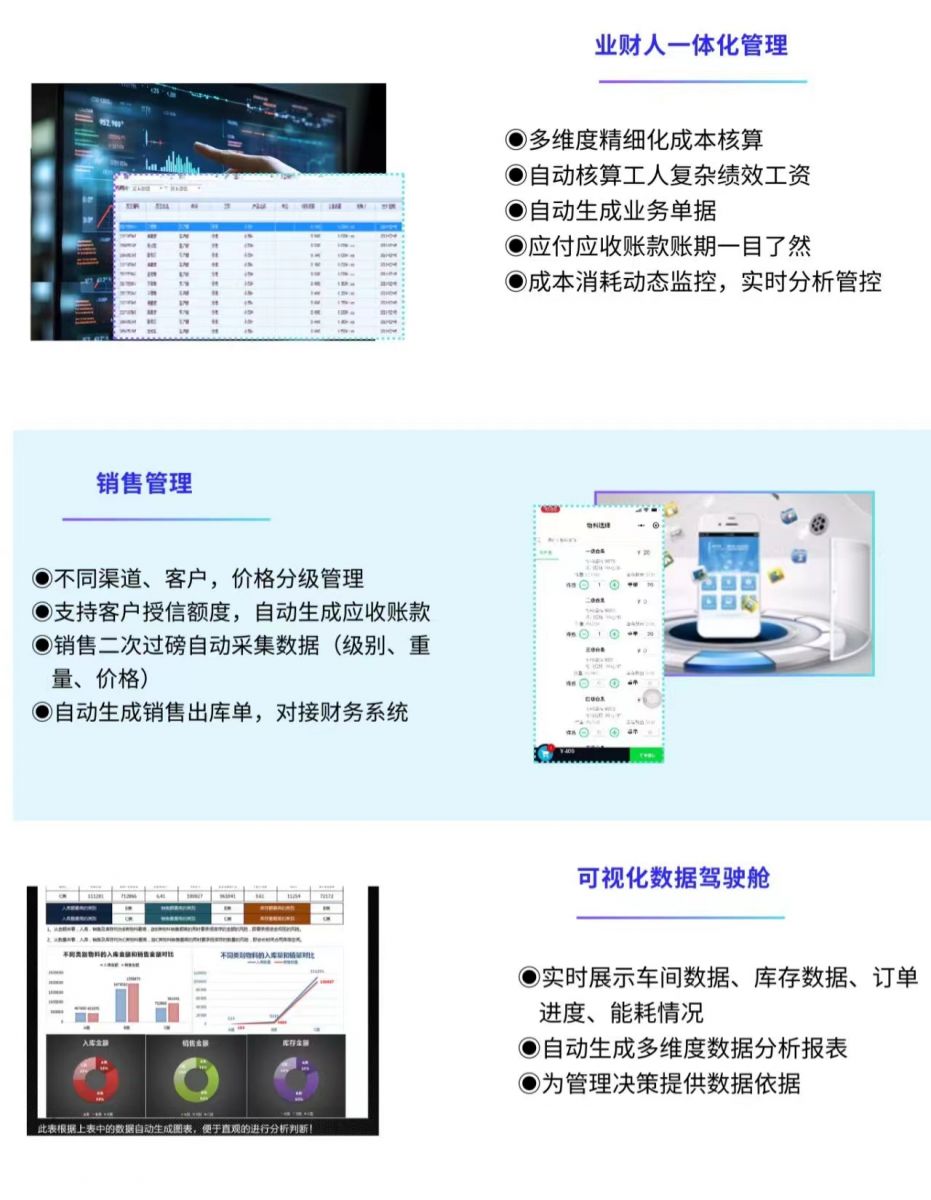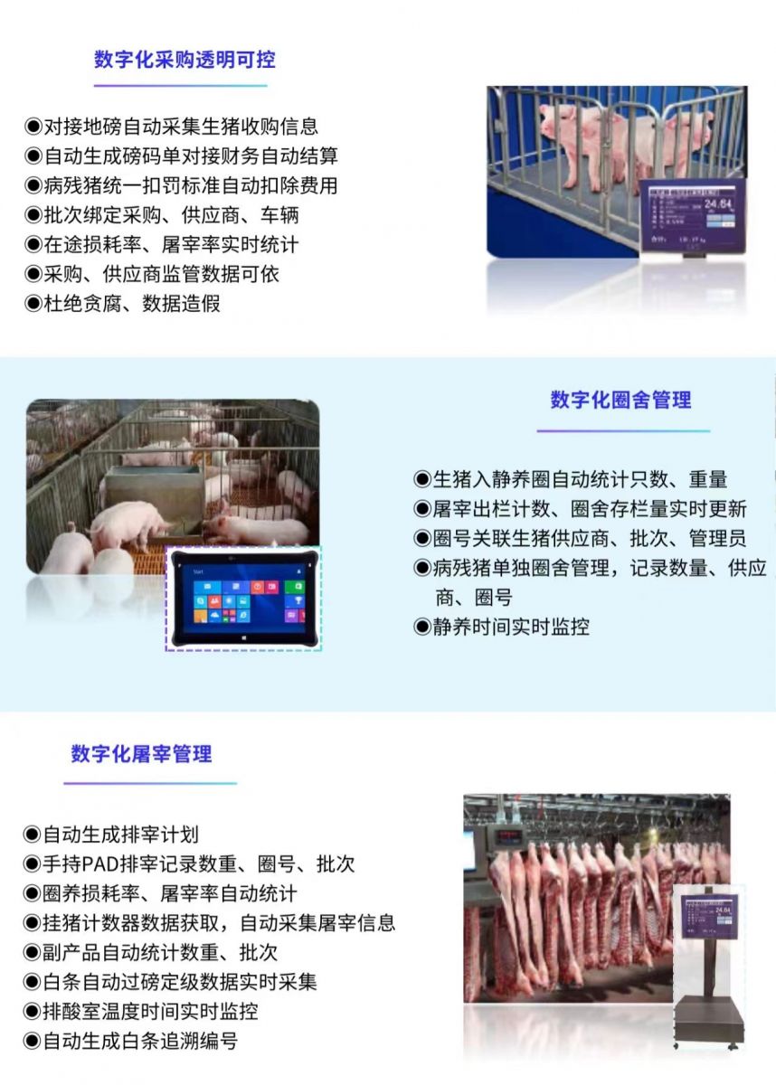 通過云存儲、物聯(lián)網(wǎng)、工業(yè)互聯(lián)網(wǎng)等技術(shù),對生豬采購、屠宰分割、倉儲配送所有環(huán)節(jié)進行信息化升級,實現(xiàn)采購結(jié)算透明化、屠宰分割最優(yōu)化、生產(chǎn)排產(chǎn)智能化、車間管理數(shù)字化、倉儲管理可視化、業(yè)務(wù)財務(wù)一體化等管理目標。